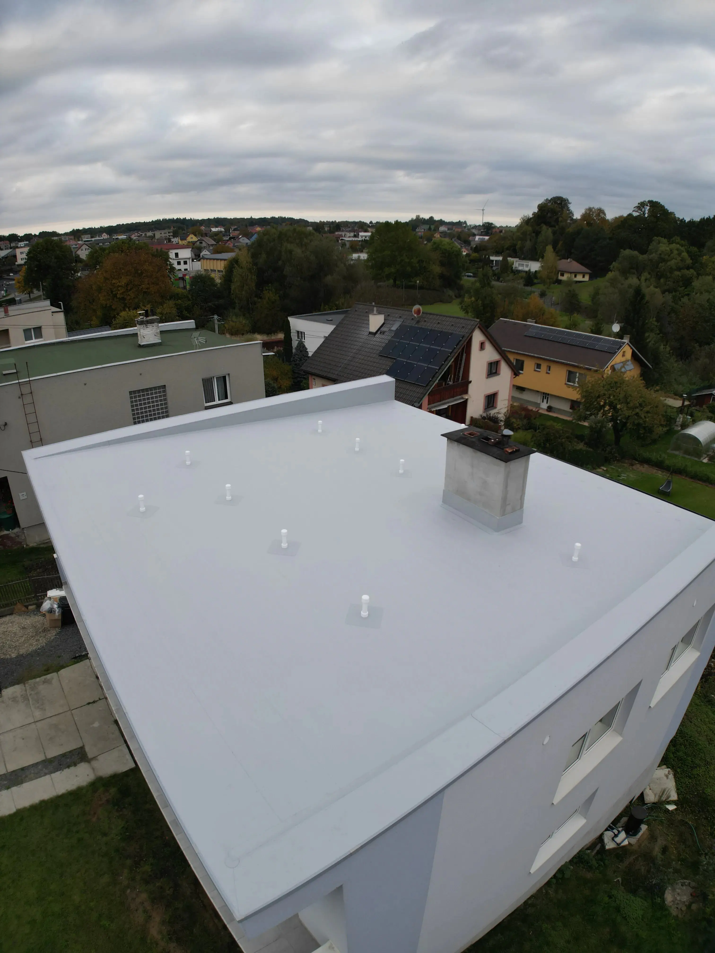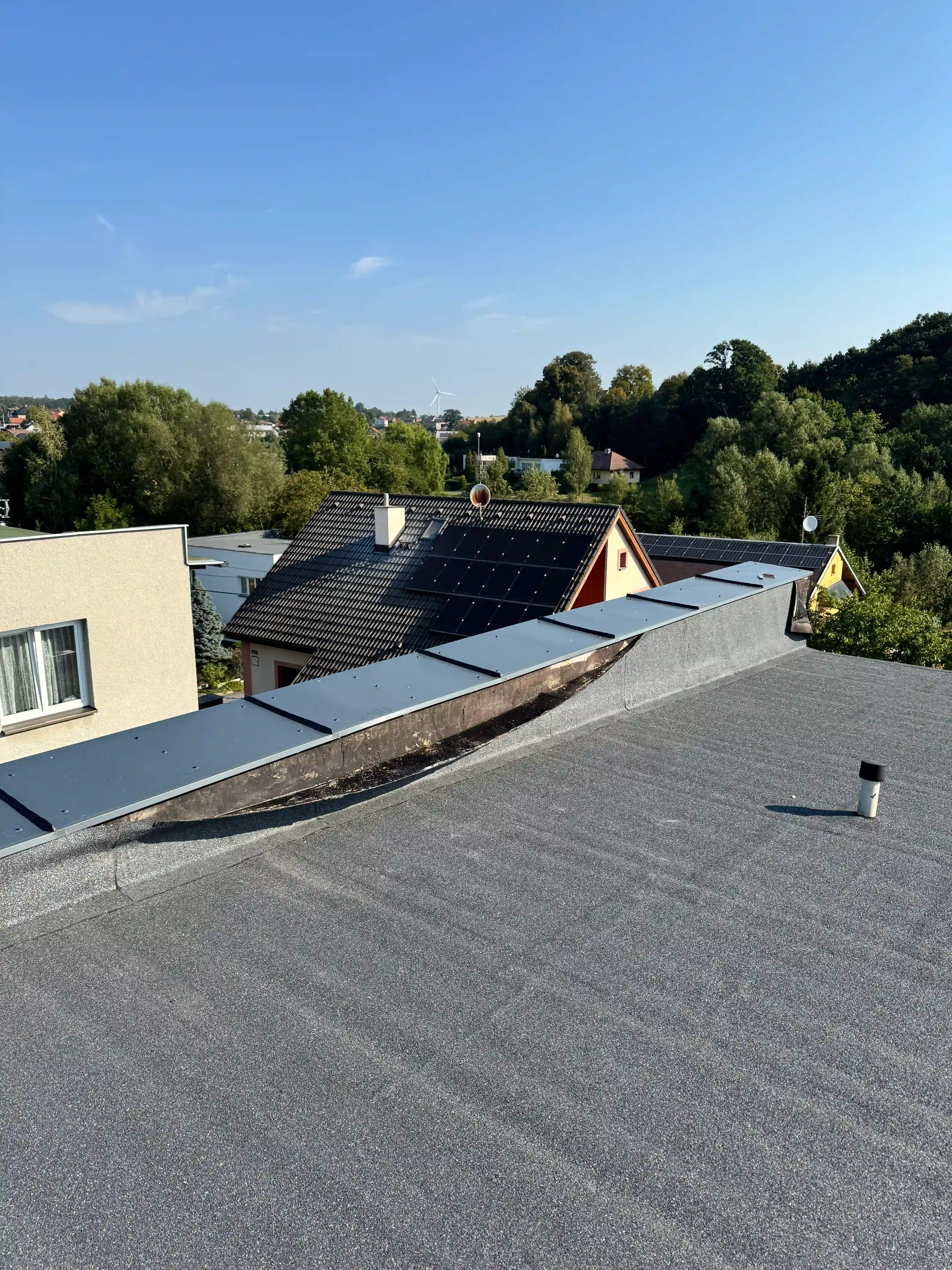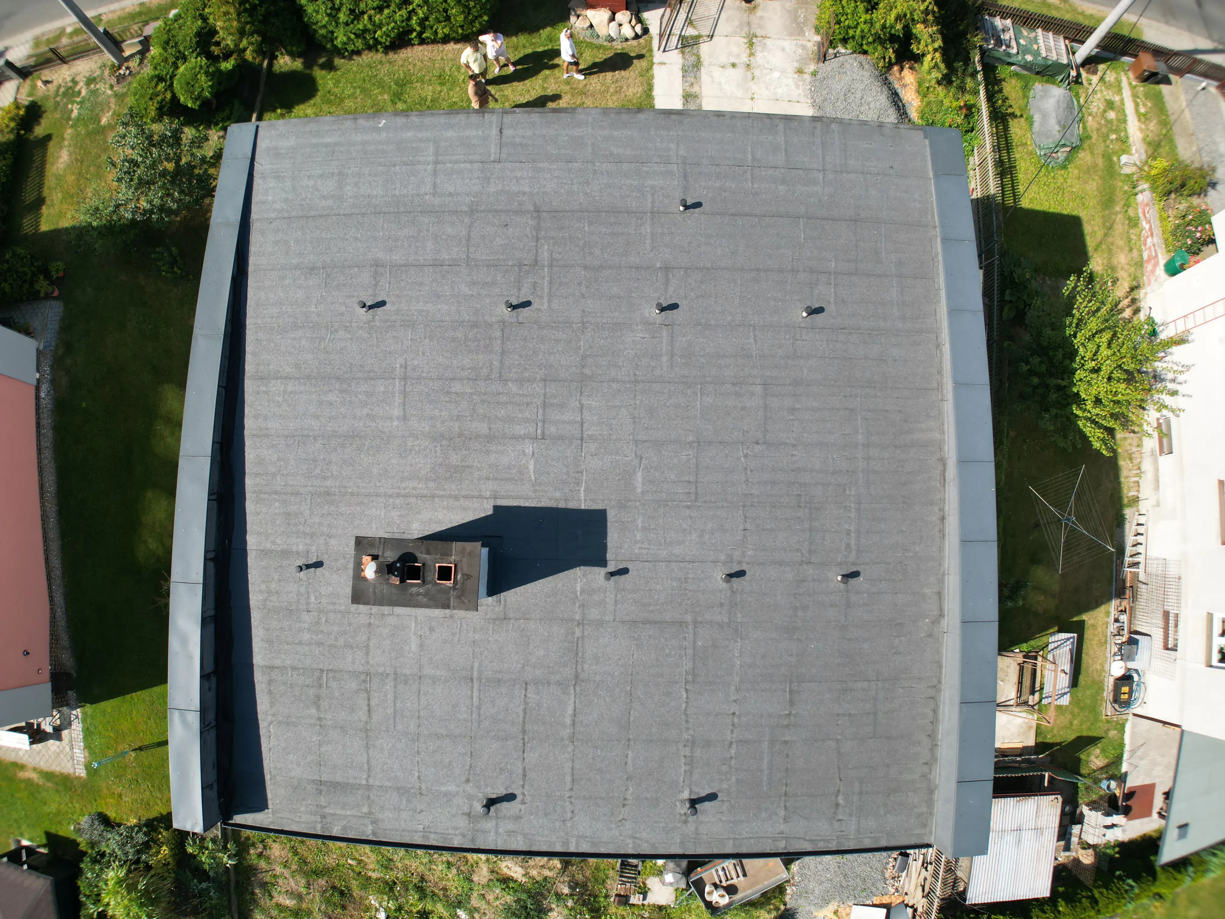 V rámci této zakázky proběhla kompletní výměna původní střešní krytiny. Jako nová krytina byla zvolena PVC střešní fólie, která nabízí vysokou životnost, odolnost vůči UV záření i povětrnostním vlivům. Střecha byla při zahájení prací v havarijním stavu – původní asfaltová lepenka byla poškozená, místy netěsná a do konstrukce zatékalo.